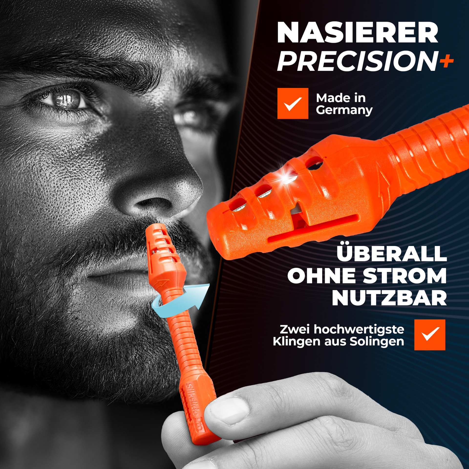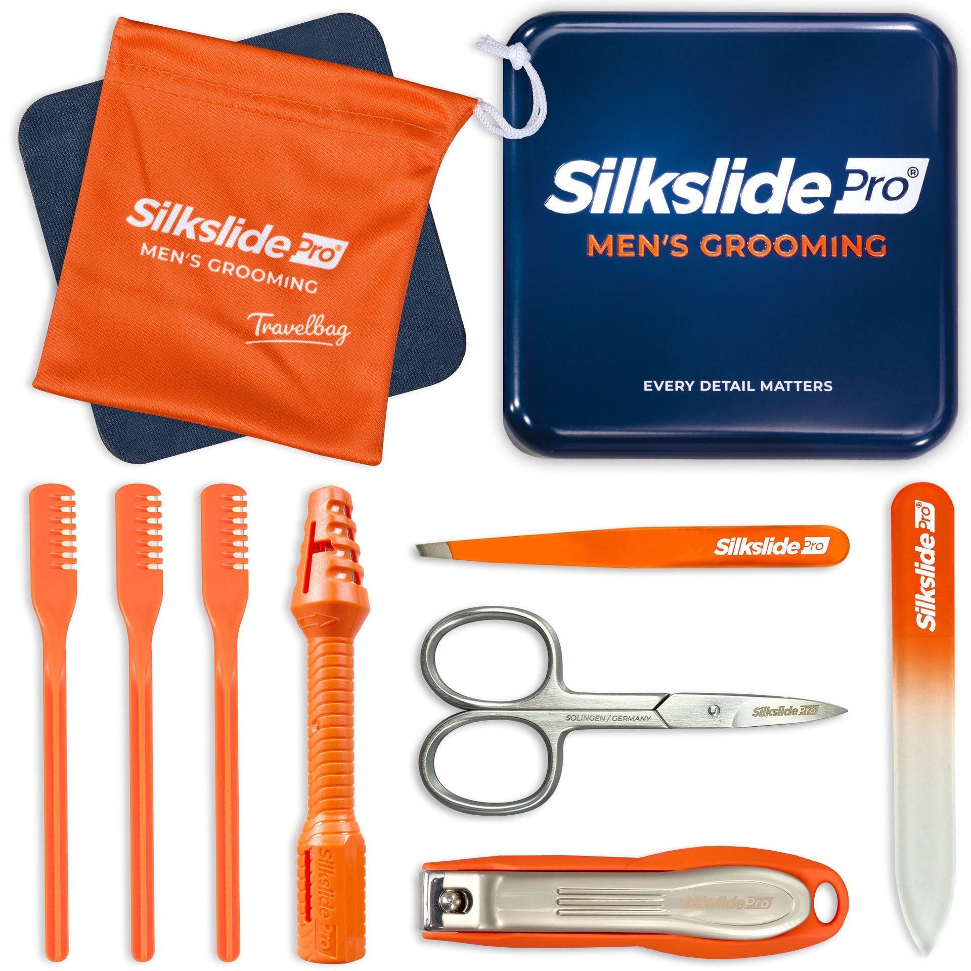 In diesem hochwertigen Set darf unser Meisterstück, der SilkslidePro Precision+ in leuchtendem Orange, natürlich nicht fehlen. Zusätzlich ist auch ein 3er-Set des Silkslide® One enthalten, denn schließlich ist jede Nase einzigartig.