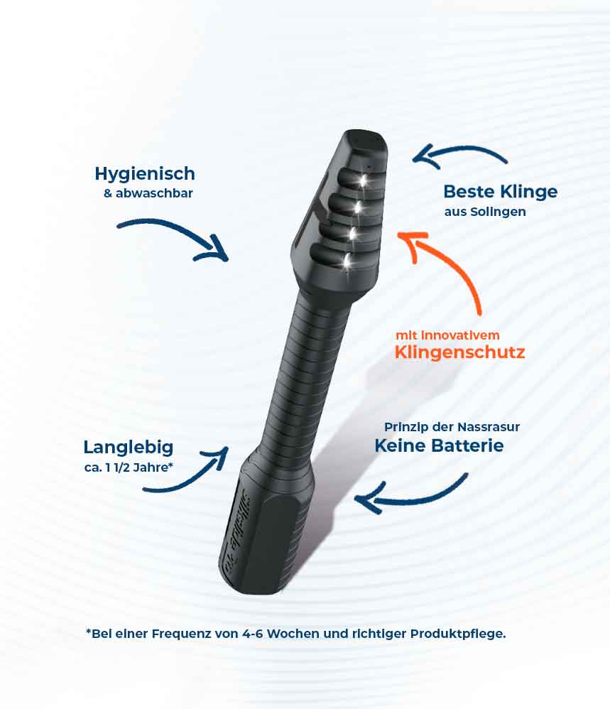 Beim SilkslidePro® Precision+ ist alles 100% Made in Germany. Beste Klingen aus Solingen, aus der gleichen Schmiede, die auch OP-Klingen für Skalpelle herstellt. Bester medizinischer Kunststoff, beste Verarbeitung und maximal beste hygienische Maßstäbe, wie sie auch für medizinische Produkte gelten. Kontrolliert vom ersten bis zum letzten Schritt.
